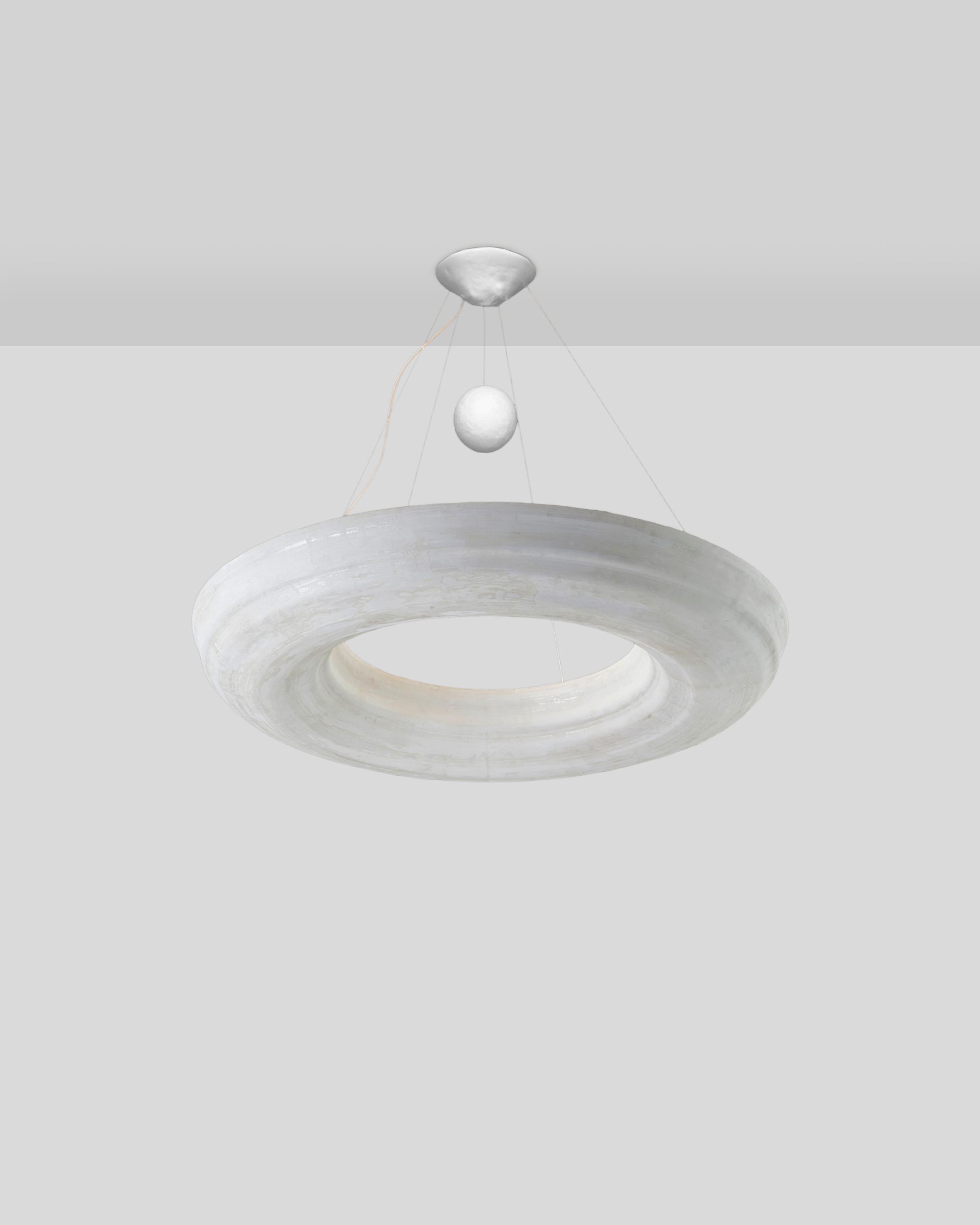 The Sacramento ceiling lamp is a striking sculptural piece that merges geometry, balance, and light into a seamless artistic composition. Crafted from fine plaster, its circular ring encases a suspended sphere, evoking a sense of celestial harmony and weightlessness. The interplay between the solid structure and the floating element creates an intriguing tension, as if the piece defies gravity, inviting the viewer to contemplate the delicate equilibrium of forms.